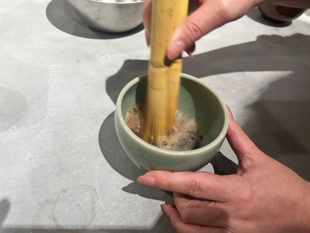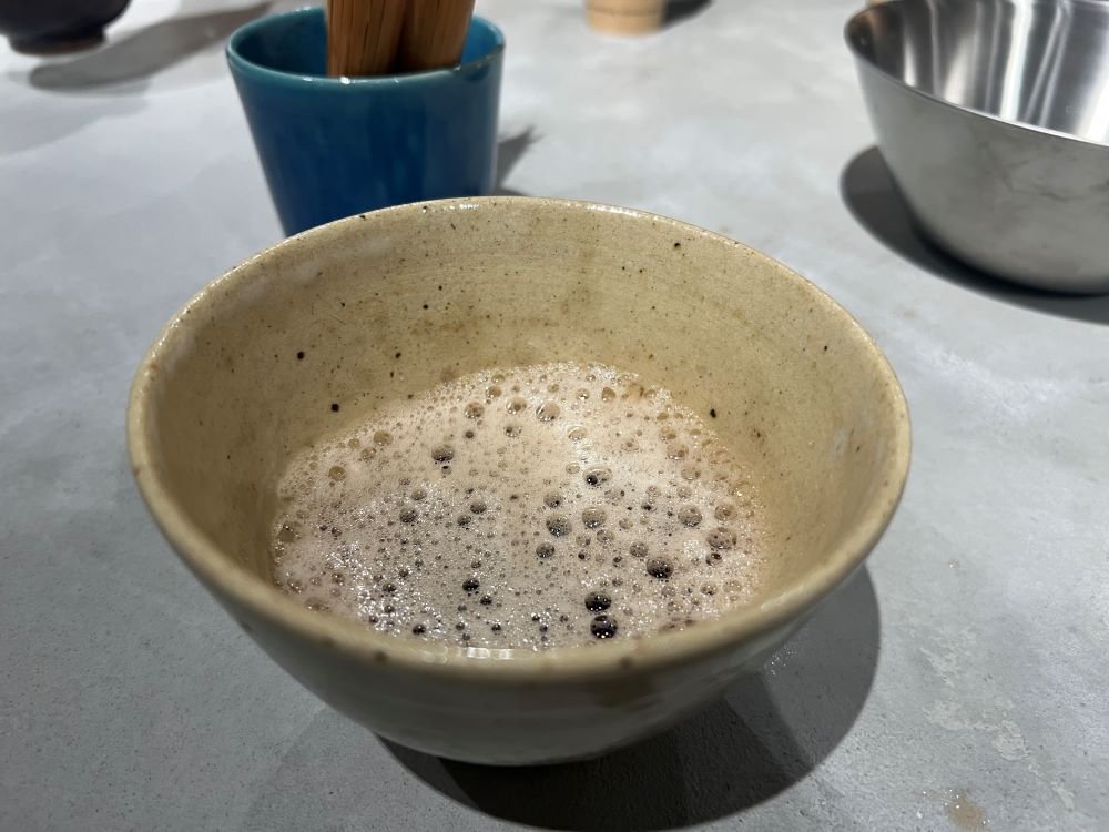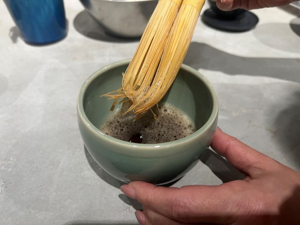 キッチン台に用意された夫婦茶筅(めおとちゃせん)を使い、注がれたお茶を自分の手で泡立てて、そのまま飲むという流れです。