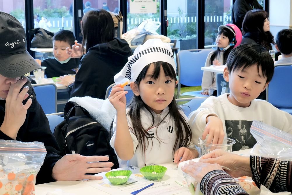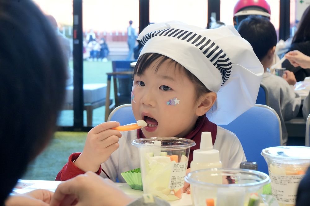 たくさんシェイクしてお腹が空いたのか、普段はあまり野菜を食べないという子どもたちも、むしゃむしゃバリバリと豆乳マヨネーズにディップした野菜を試食しています。中には普段まったく野菜を食べないというが、豆乳マヨネーズをつけて美味しそうに食べる姿も!その子の表情はどこか誇らしげで、見守るパパママの微笑みも印象的でした。