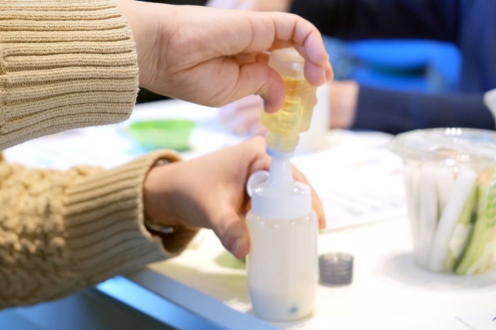 まずは豆乳マヨネーズづくりの説明とレクチャーからスタート。主原料として豆乳を使う理由や体験の流れをスライドで説明していきます。いよいよ1回目のシェイクタイムに突入!あらかじめ豆乳+塩麹+りんご酢が入ったシェイカーに適量の米油を混ぜてながら、一生懸命シェイカーを振っていきます。下は未就学児から上はおじいちゃんおばあちゃんまで、会場のあちこちでシェイカーをフリフリする笑顔が見られました。