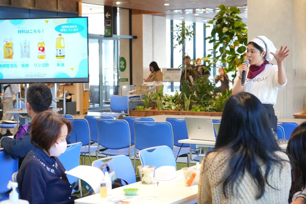 ステージ登壇したweeeat!スタッフは、これまで300ものプラントベースレシピを考案してきたメンバーのひとりでありながら、仕事と子育てを両立させてきたママでもあります。専門的な栄養のお話だけではなく、子育ての経験談を交えたお話で会場の子育てママたちの共感を得ていました。